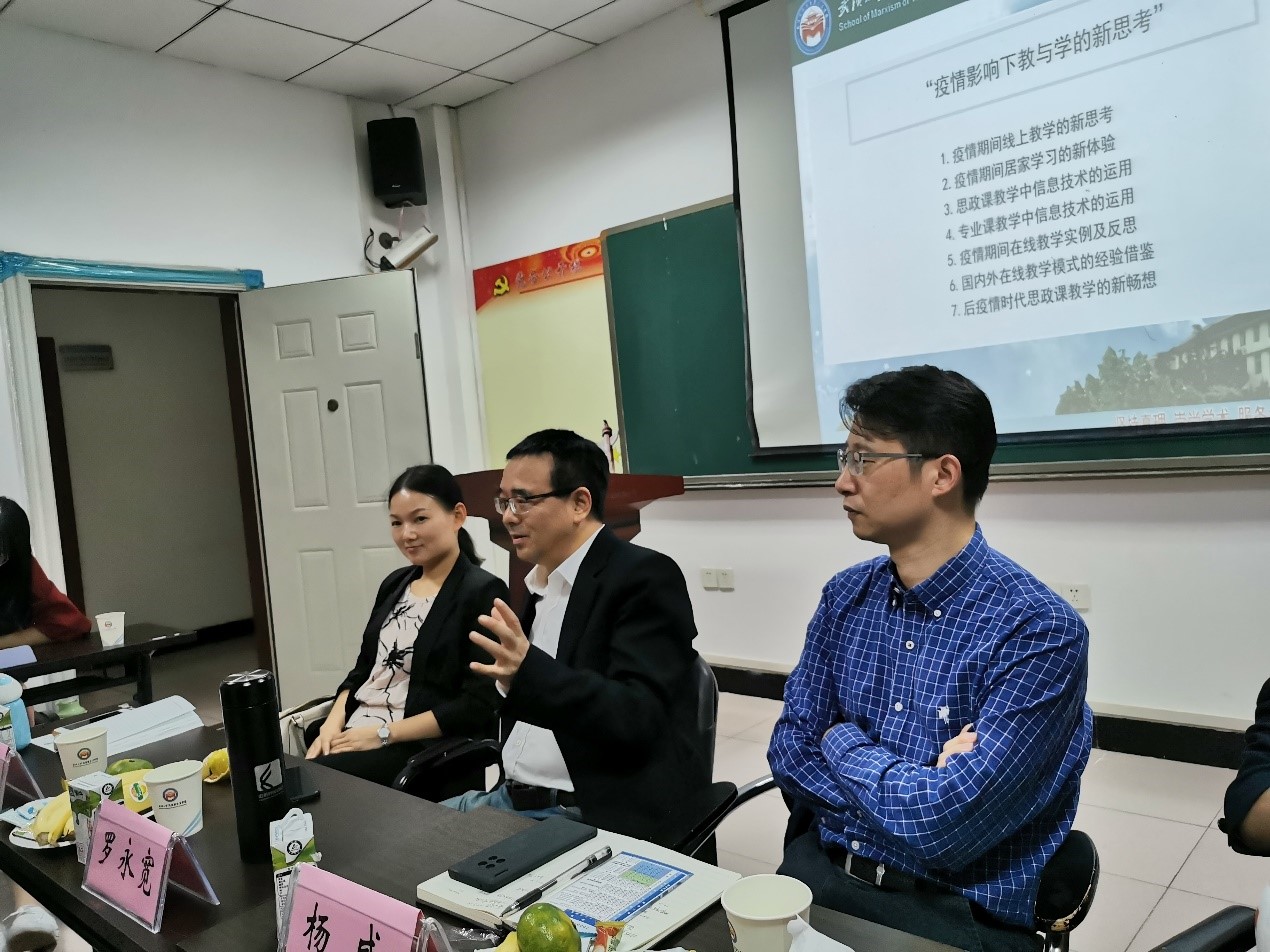 交流环节,在座的老师和同学们就“云思政和网络思政的区别”、“疫情中线上教学的危与机”、“线上教学对教师角色的赋能”等话题展开热烈讨论。同时参加西部计划的两位硕士研究生结合自己的教学经历分别指出录播教学和直播教学的区别,小学生、中学生与大学生网课的区别。