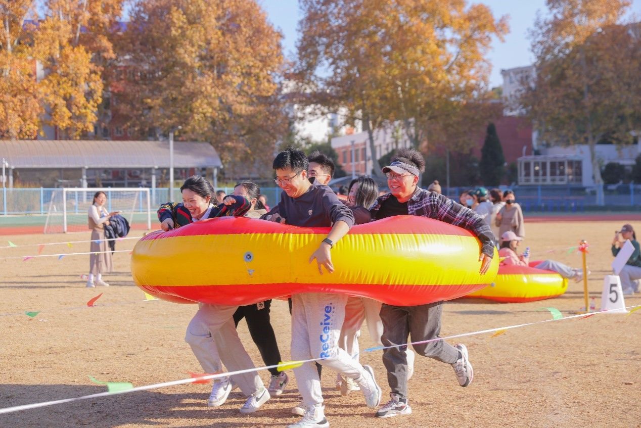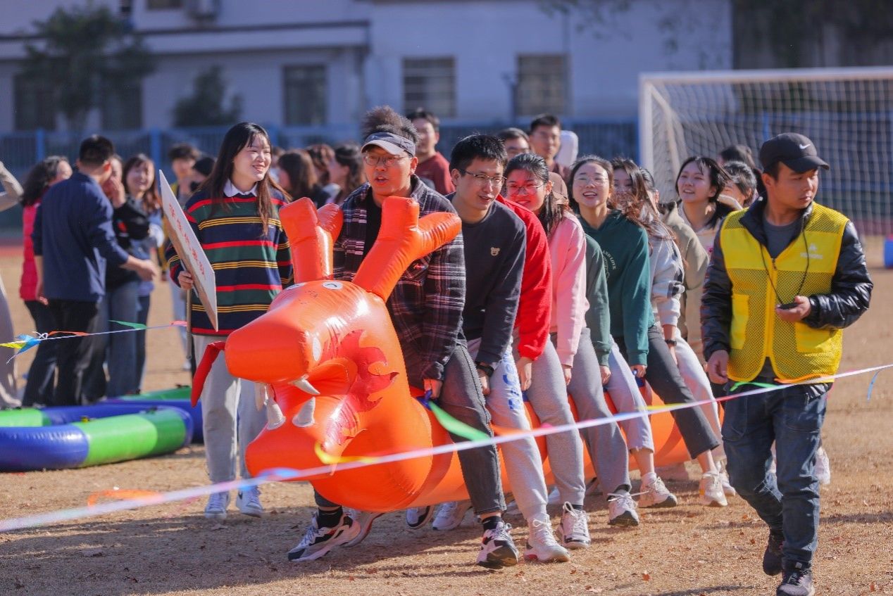 共设6个趣味比赛项目:龙行天下、风雨同舟、十拿九稳、穿越人墙、携手共进,均需要团队协作完成。主持人引领大家热身后,六支队伍相继完成六个项目的比拼,师生们在玩乐中进行体育锻炼,在体育锻炼中凝聚团结精神,在繁忙的工作和学业中放松自己。