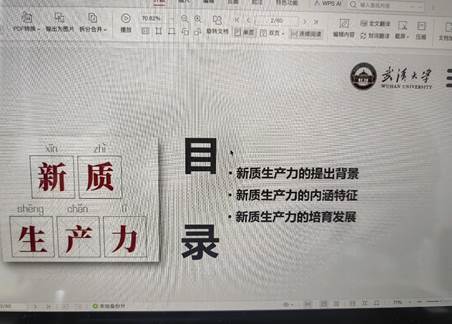 陈慧女以《新质生产力》为题,围绕新质生产力的提出背景、内涵特征、培育发展等方面,用大量的事例、翔实的数据对新质生产力进行了全面解读,强调要通过授课,让学生充分认识强调发展新质生产力,是时代所需、发展所急、大势所趋,是建设社会主义现代化强国的坚实支撑,是推动高质量发展的强大动力,是持续提升国际竞争力的战略举措,也是满足人民群众对美好生活向往的现实需要。