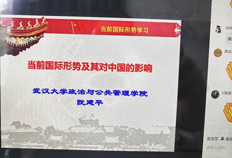 阮建平以《当前国际形势及其对中国的影响》为题,对当前国际形势的基本特点进行了深刻分析,并用大量事例说明,当前和今后一个时期,我国发展仍然处于重要战略机遇期,但机遇和挑战都有新的发展变化,对此,我们要立足自身,保持战略定力,做好国内建设,要面对现实,增强底线意识,做实风险防范,要着眼未来,主动战略谋划,统筹国际布局。