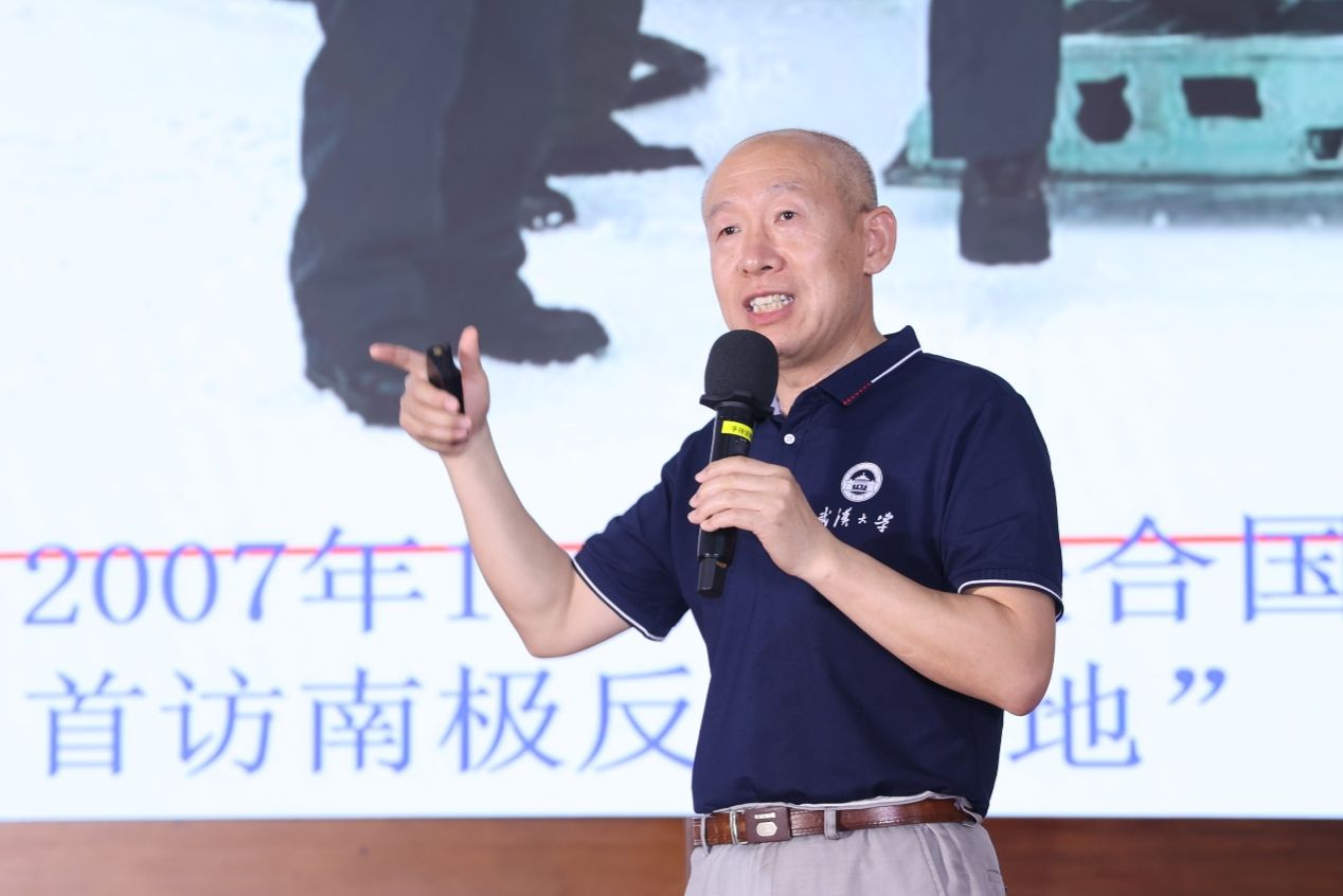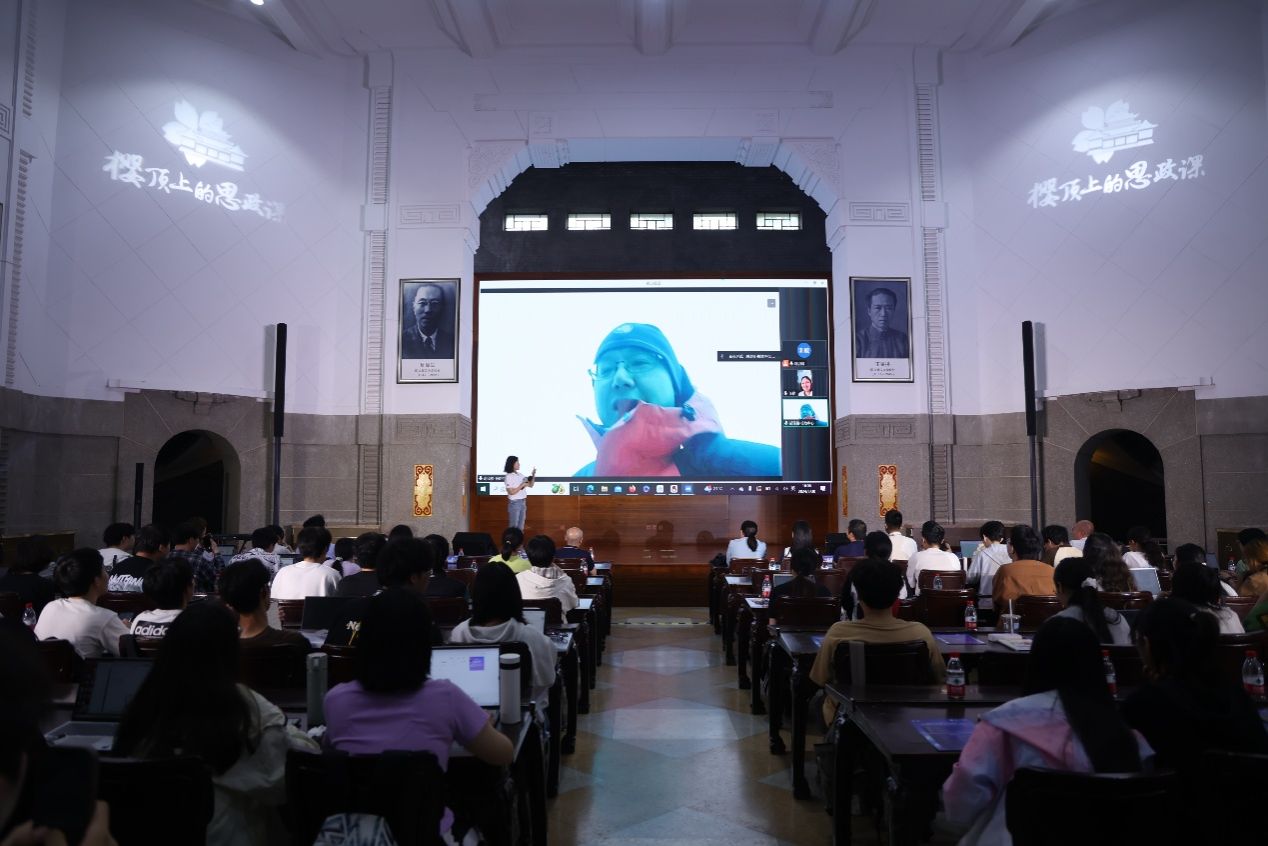 参加中国南北极科学考察的师生代表王泽民教授、褚馨德博士、耿通博士现场授课,中国南极中山站站长胡泽骏校友线上展示。全校2022级近7000名本科生通过“线上+线下”相结合的方式同上一堂“樱顶上的思政课”。