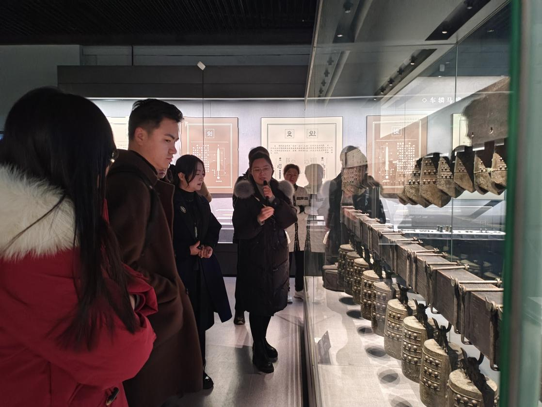 师生一行首先在一楼参观了博物馆的“漫天星斗——江汉平原原始文化展”“吉金耀彩——荆州出土铜器展”,大溪文化、屈家岭文化、石家河文化等一众文化遗址和荆楚地区出土的大量青铜器遗存让人目不暇接。殷商南土,周道尊尊;秦汉一统,楚风遗韵。一楼展区主要将荆楚文化置于中华文化的语境背景下进行叙述,将文明成因在唯物史观的叙事基调中进行阐述,让来访者对考古成就和荆楚文化有了总体认知。