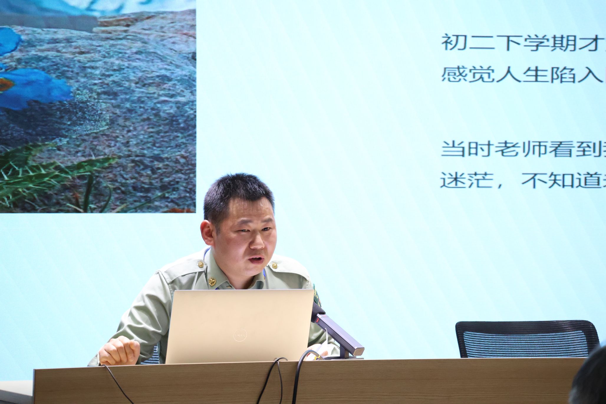 军休干部金腾龙志愿服务队队长金腾龙同志的故事同样震撼人心。金腾龙同志从入伍初心、信仰的力量、军旅淬炼、青春寄语四个部分,介绍了自己入伍前后的经历与思想转变情况。其中,他着重讲述了自己在西藏参军时的挑战、在抗震救灾过程中感受到的作为共产党员的无上荣光,以及退役后成立志愿服务队的坚守,他用军旅生涯诠释了“共产党员的信仰比雪山更坚定”。当提及退役后组建志愿服务队时,他向青年党员们发出号召:“要找到属于自己的战场,面对困难时不要轻易放弃,坚持不懈才能百炼成钢,把个人理想融入民族复兴征程”。