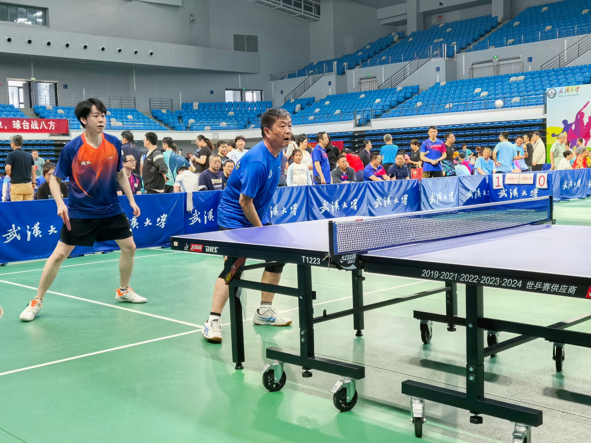凭借男单和师生双打各取一分。数学与统计学院则在女单和混合双打中获得优胜,双方战成2:2平。决胜盘登场的是从千里之外特地赶回参赛的退休教师孙康,他面对经验丰富、实力不俗的对手,毫不畏惧,沉着冷静,技战术发挥得当,凭借快速多变的上旋球和威力十足的正手攻,以3:1战胜对手,为球队锁定胜局。
