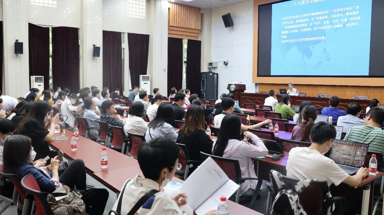 人文社会资深教授、校中国边界与海洋研究院院长、国家领土主权与海洋权益协同创新中心主任、首席专家的胡德坤教授以“擘画世界——习近平中国共产党第二十次全国代表大会报告的世界历史意义”为题作专题辅导报告。学习会由学院党委书记罗永宽主持,学院领导班子成员、全体教职工党员、学生党支部书记及部分学生党员代表等参加会议。