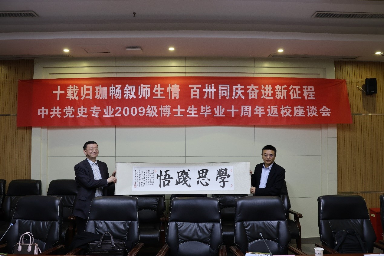 交流环节结束后,蒉鸿强代表2009级全体博士生向学院和老师赠送书法作品“学思践悟”,表达对老师、学院的感激之情,祝福学院开创更加美好的明天。