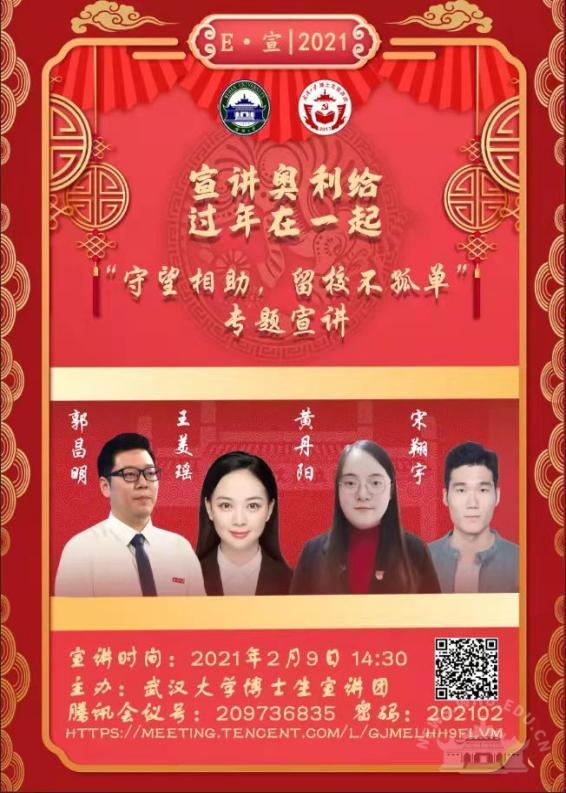 作为宣讲团团长,付玉璋抓住抗击肺炎新冠肺炎疫情和建党百年两个关键节点,主动谋划,带领博士生宣讲团,取得突出成绩。疫情期间,积极组织全国高校线上联合抗疫志愿宣讲系列活动5场。在2021年寒假期间,新冠肺炎疫情在河北省出现反复时,该生第一时间与河北师范大学等4所河北高校取得联系,开展“同心共‘冀’,共克‘石’艰”线上联合宣讲,撰写抗疫宣言,分享武汉高校学子抗疫相关经验。