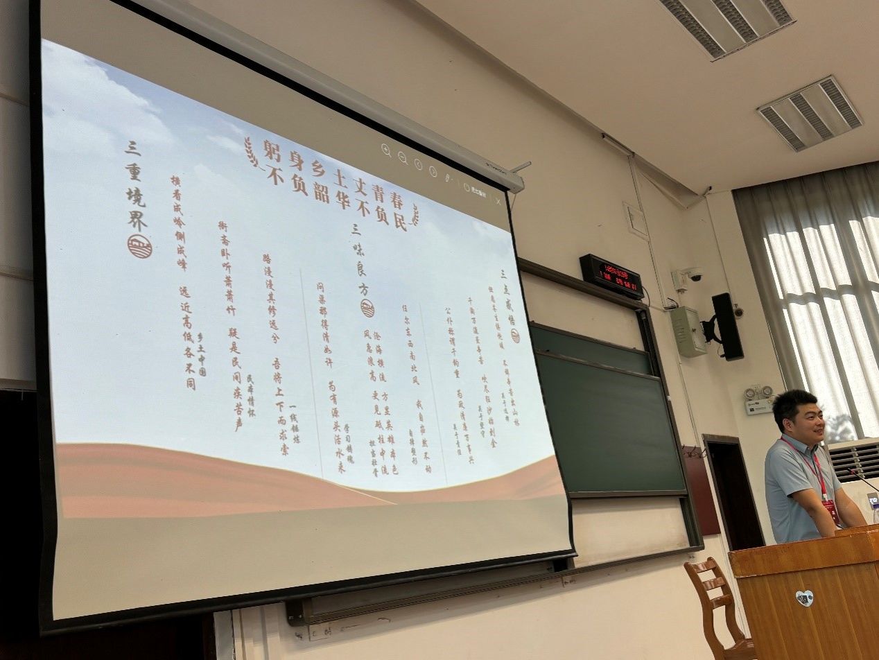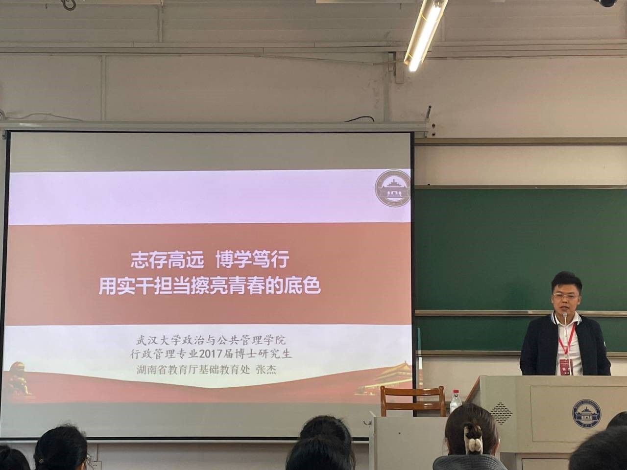来自湖南省的选调生张杰校友,系我校政治与公共管理学院2017届毕业生。他结合自己的基层工作经历,重点讲解了选调生们在教育帮扶工作中的不懈努力和奉献精神,并介绍了其带领下“爱心+扶志”教育帮扶模式的形成历程,指出这一模式不仅仅关注物质帮助,更着眼于激发学子们的内在潜力与志向。张杰还就青年学生关心和关注的乡村非遗工艺的传承与保护等问题作了分享与回应。