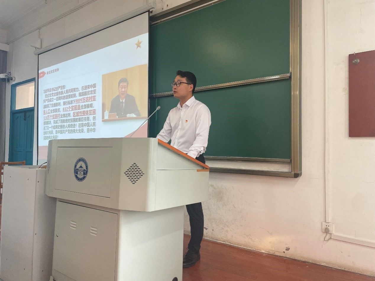 来自西藏自治区的选调生梅云亮,系我校2017年经济与管理学院的毕业生,2018年参加脱贫攻坚驻村工作。他以“弘扬爱国守边精神,做神圣国土的守护者、幸福家园的建设者”为主题,在两个课堂上作了分享。他重点阐述了特别能吃苦、特别能战斗、特别能忍耐、特别能团结、特别能奉献的“老西藏精神”,并援引张国华将军、优秀共产党员孔繁森和山南隆子县玉麦乡的桑杰曲巴和卓嘎、央宗父女三人几十年如一日放牧守边等的感人事迹,动情说道:“在高原上工作,最稀缺的是氧气,最宝贵的是精神。”同学们也深受感染。