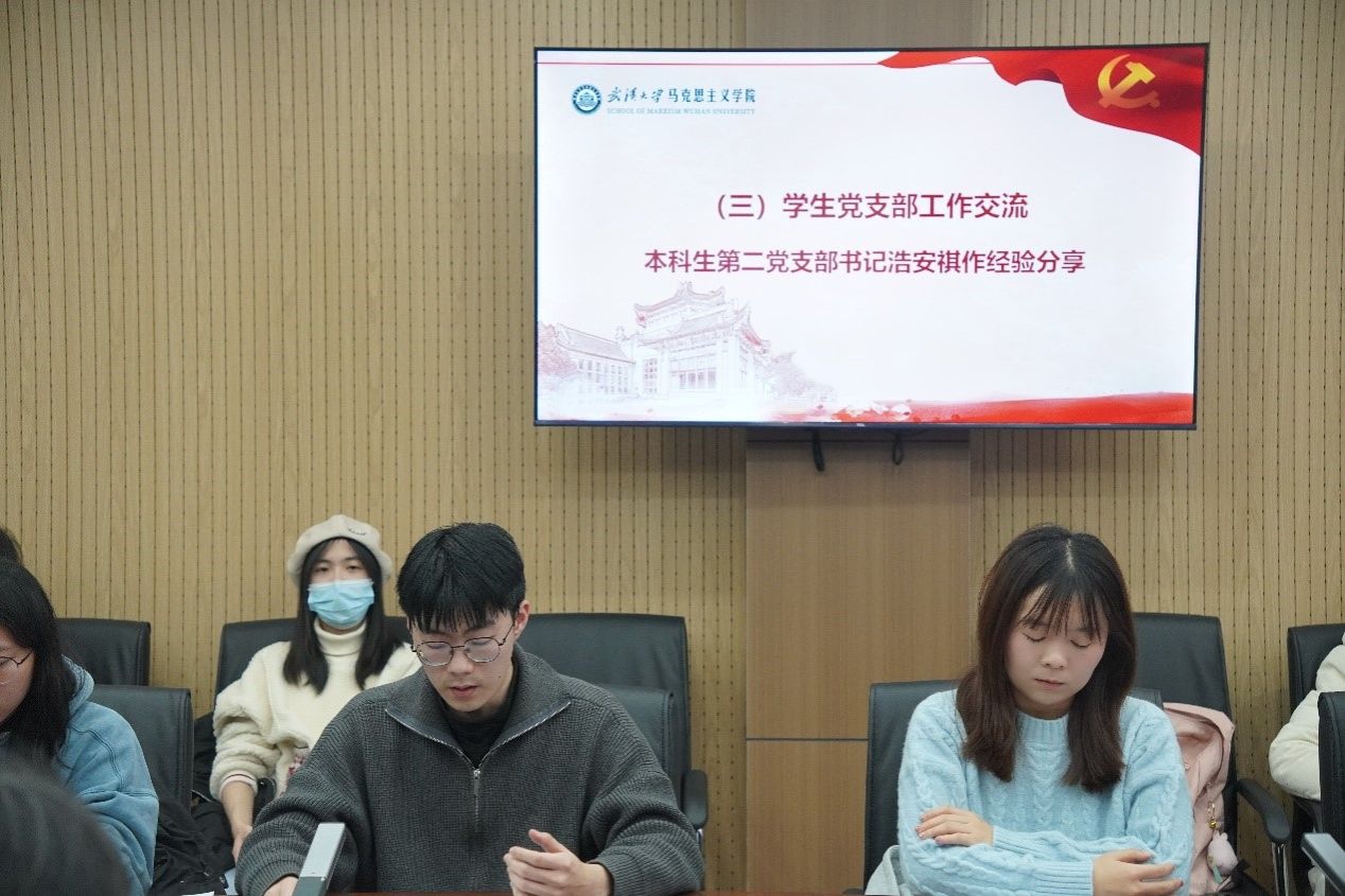 本科生第二党支部书记浩安祺分享了关于如何开展支部建设的工作经验。浩安祺同志指出了前期本科生党支部存在的培养联系难、结构失衡等问题,介绍了党支部在调整活动组织形式中总结的三个原则和方法,即变与不变相结合、整体与部分相结合、党员教育与培养联系相结合,以便充分凝聚支部成员的力量,抓好组织生活工作,共同努力建设好战斗堡垒。